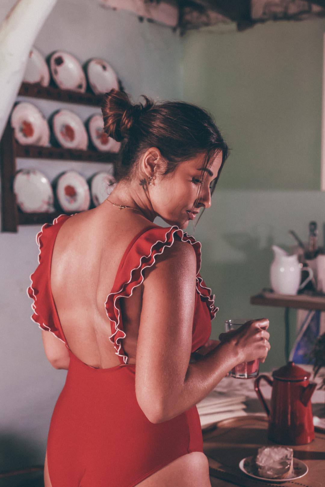 Deep V-neckline. Designed with double ruffle and piping.